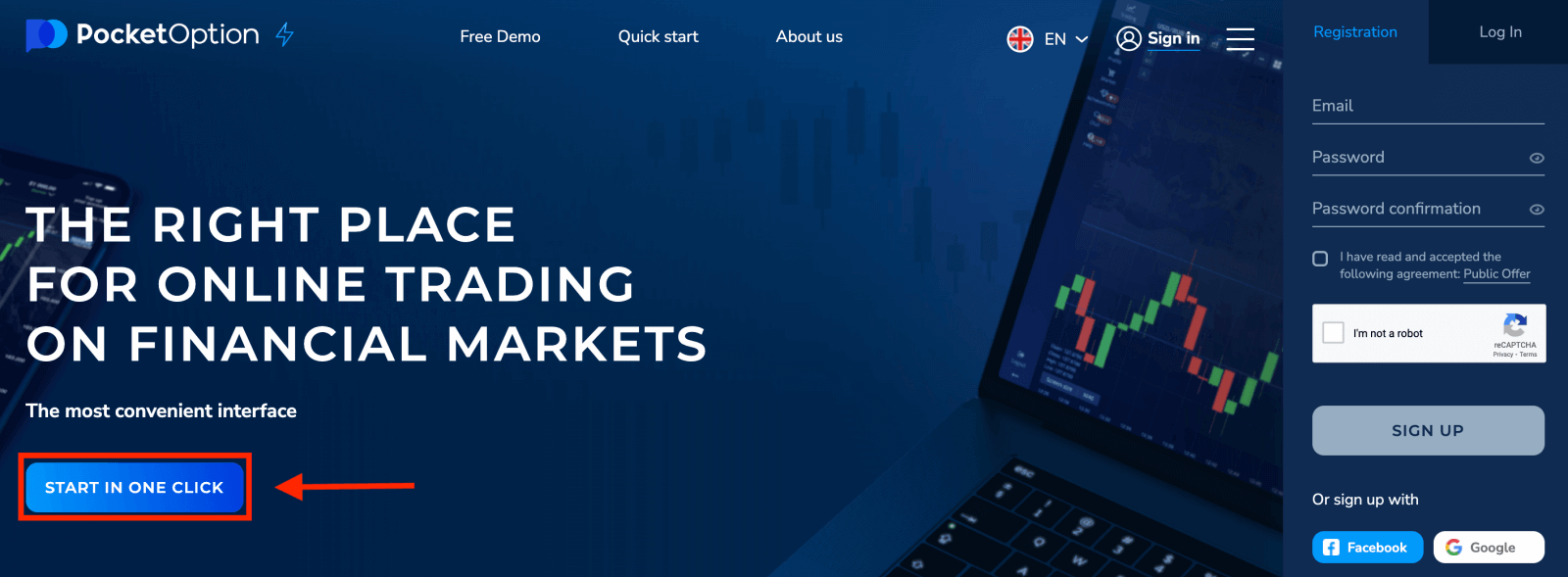 1. Sangat mudah untuk mendaftar untuk akaun dagangan Pocket Option. Untuk berbuat demikian, klik " Pendaftaran " pada platform web.
